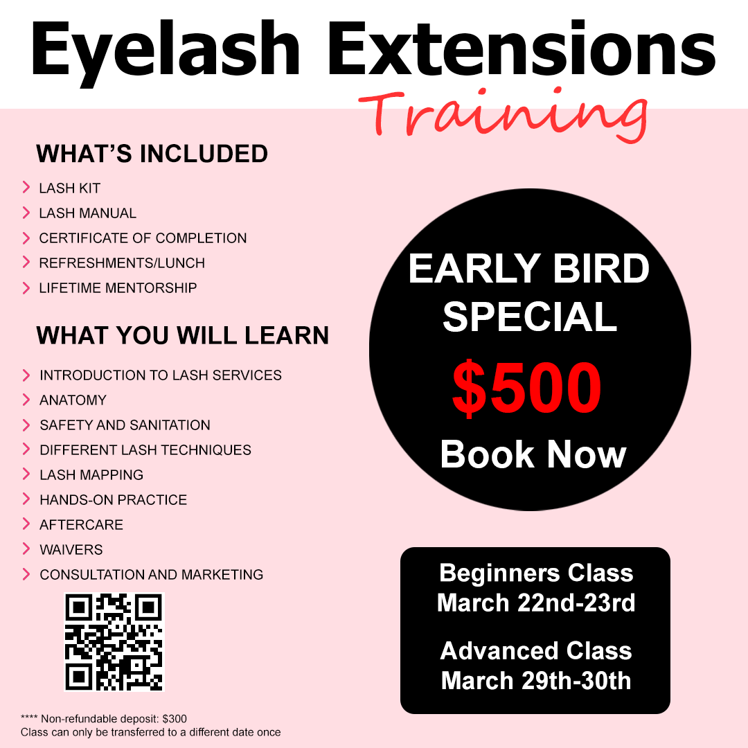 What’s included: a lash kit, lash manual, certificate, refreshments/lunch, lifetime mentorship. Must place a non refundable deposit of $300 and you can only transfer the class to a different date only 1 time.